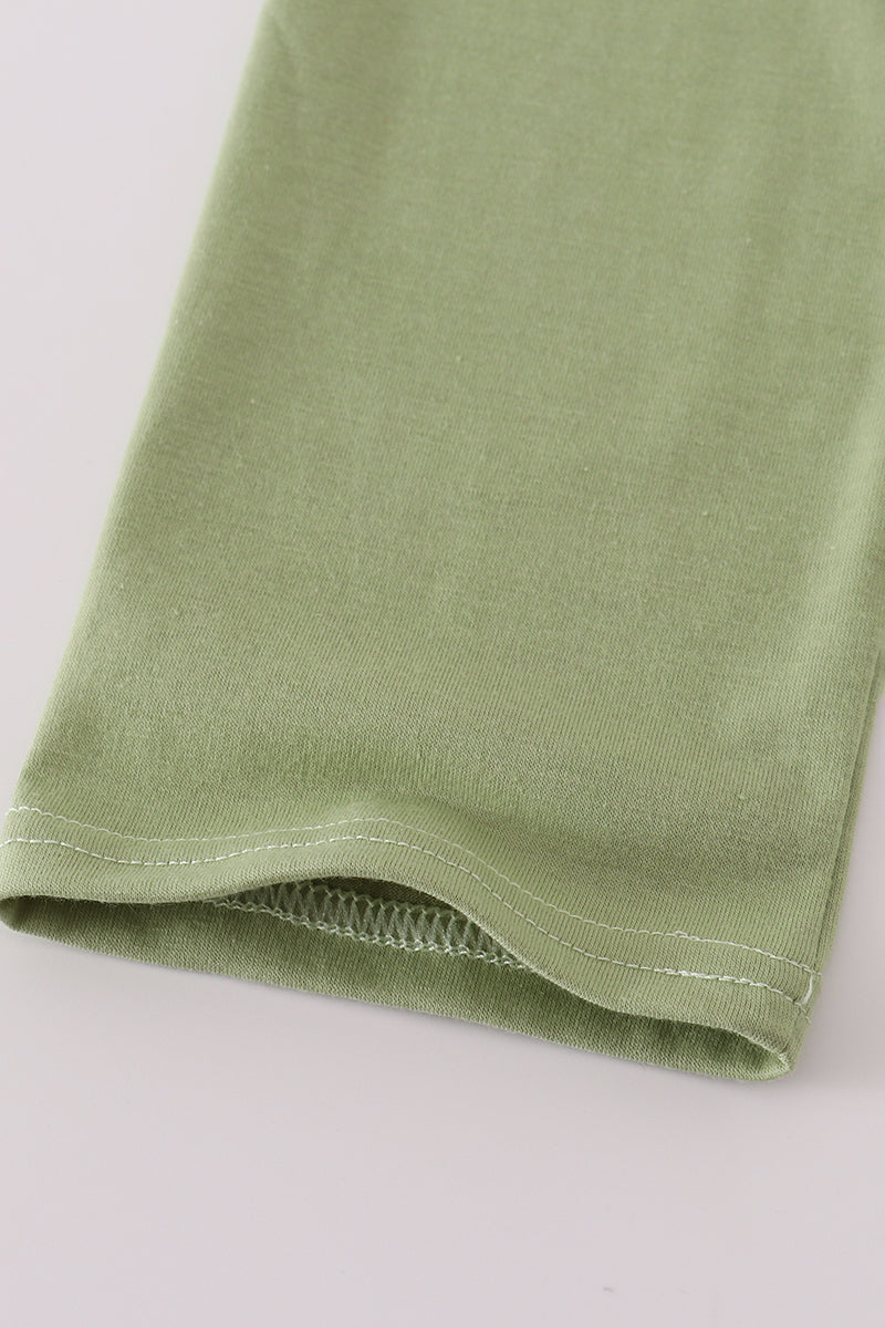 Your little turkey will look picture-perfect this Thanksgiving in this adorable two-piece set! The green gingham dress features a Peter Pan collar, puff sleeves, and three embroidered turkeys across the chest for festive charm. Paired with coordinating solid green leggings, this outfit is as comfy as it is cute—perfect for family photos and holiday gatherings.